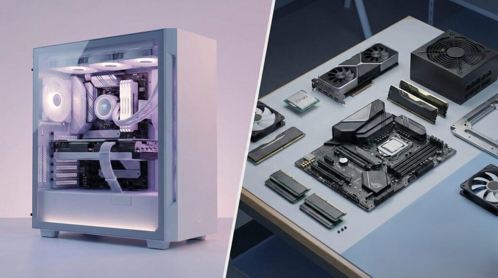 自作PCは、CPU、GPU、マザーボード、ケースなどのパーツをすべて自分で選び、ゼロから組み立てる方式です。