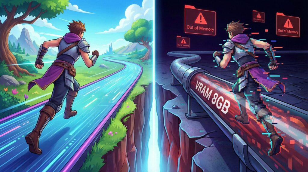 「ゲームはヌルヌル動くのに、AI生成はカクカクで動かない」という現象は、この机の狭さ(VRAM不足)が原因なのです。